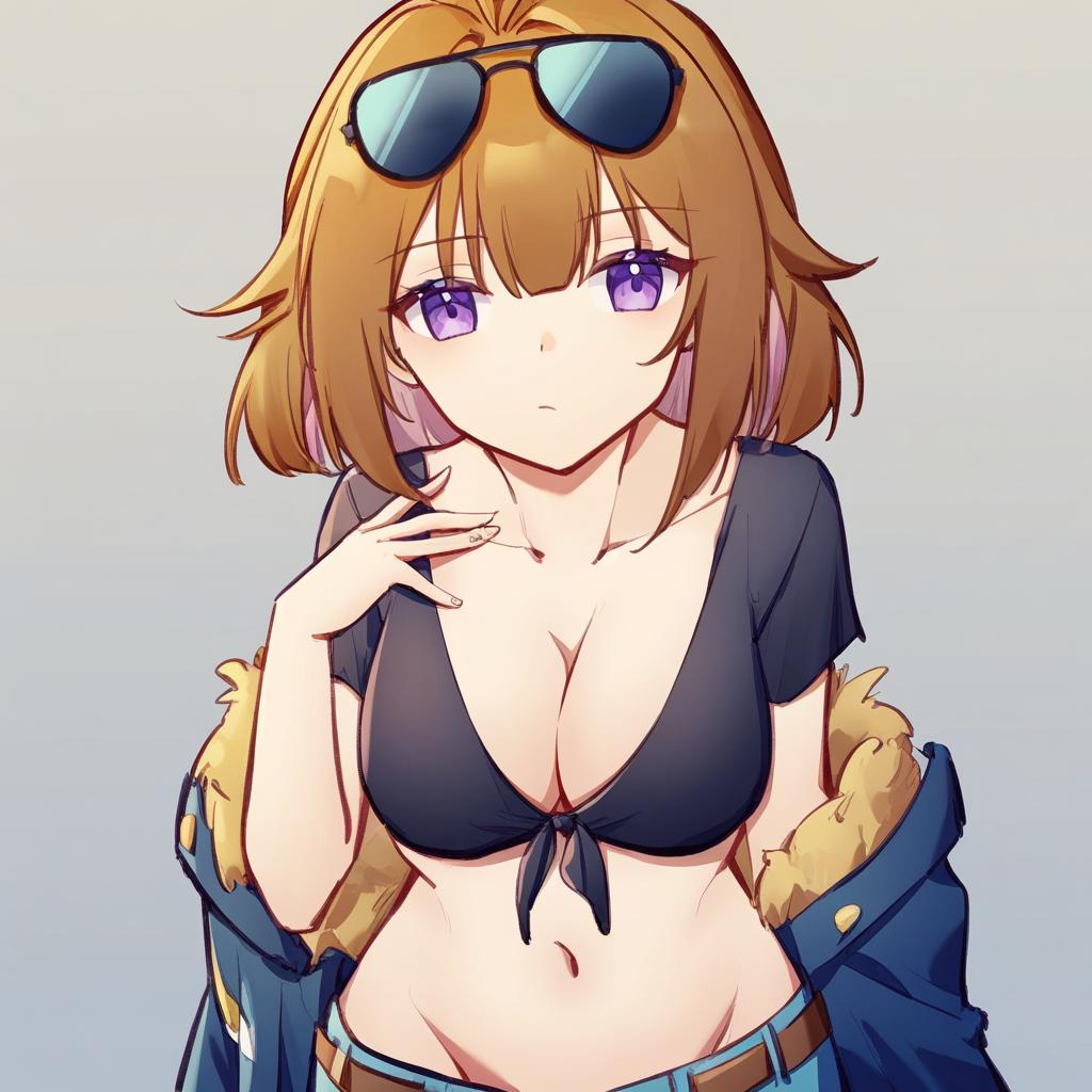 Grizzly mkv (girls' frontline), girls' frontline, 1girl, purple eyes, eyewear on head, brown hair, short hair, large breasts, cleavage, navel, sunglasses, by artist ewa (seraphhuiyu), leet
