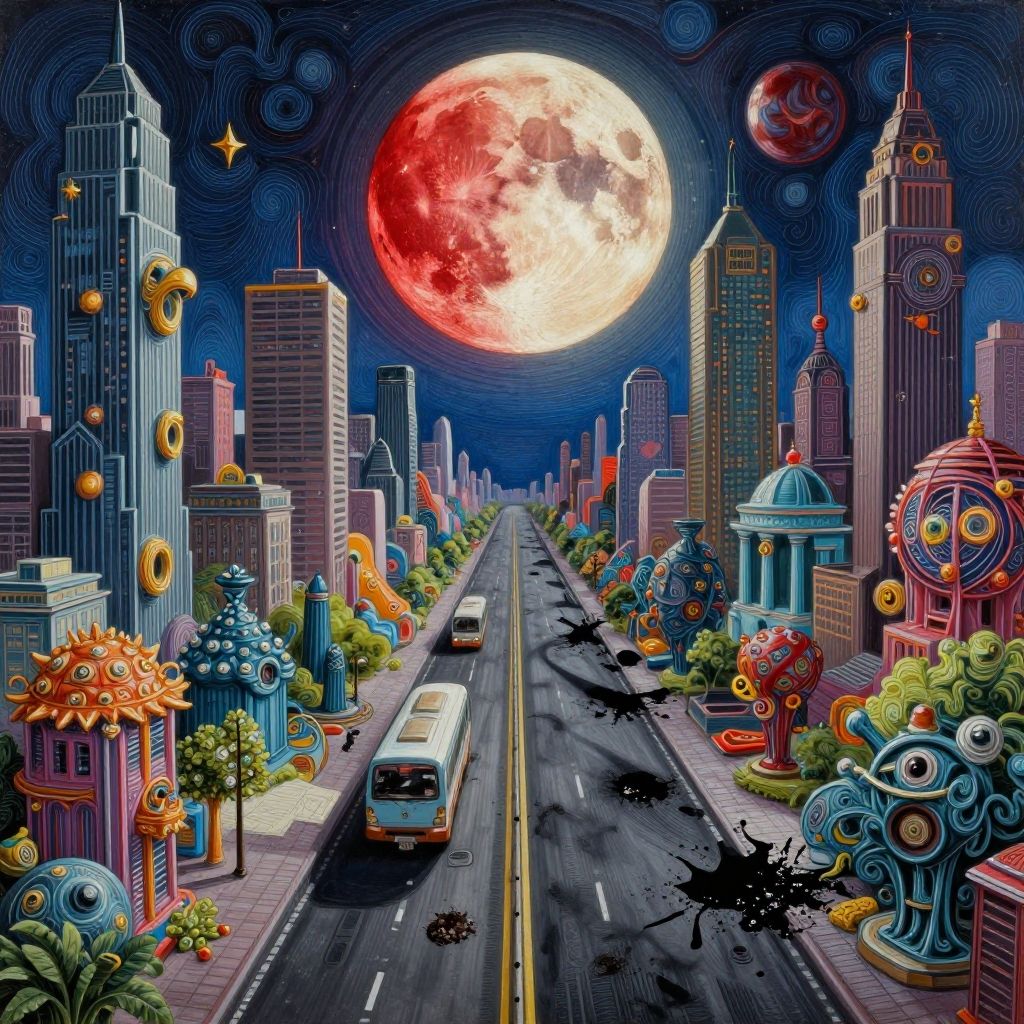 ((masterpiece, high quality, best quality, 8k, wallpaper, fine lineart, highly detailed)), magical style land art style hyperrealistic, vivid colors, intricate details, realistic style, oil paintings, acrylic paintings, watercolor paintings, digital illustrations, mixed media pieces, sculptures casting shadows, photorealistic, extreme detail, (lifelike:1.4), crisp, precise, detailed blend of organic and magical elements, (extream details:1.4), ( dark vaporwave:1.5), ( lunar), destroyed city road, metro