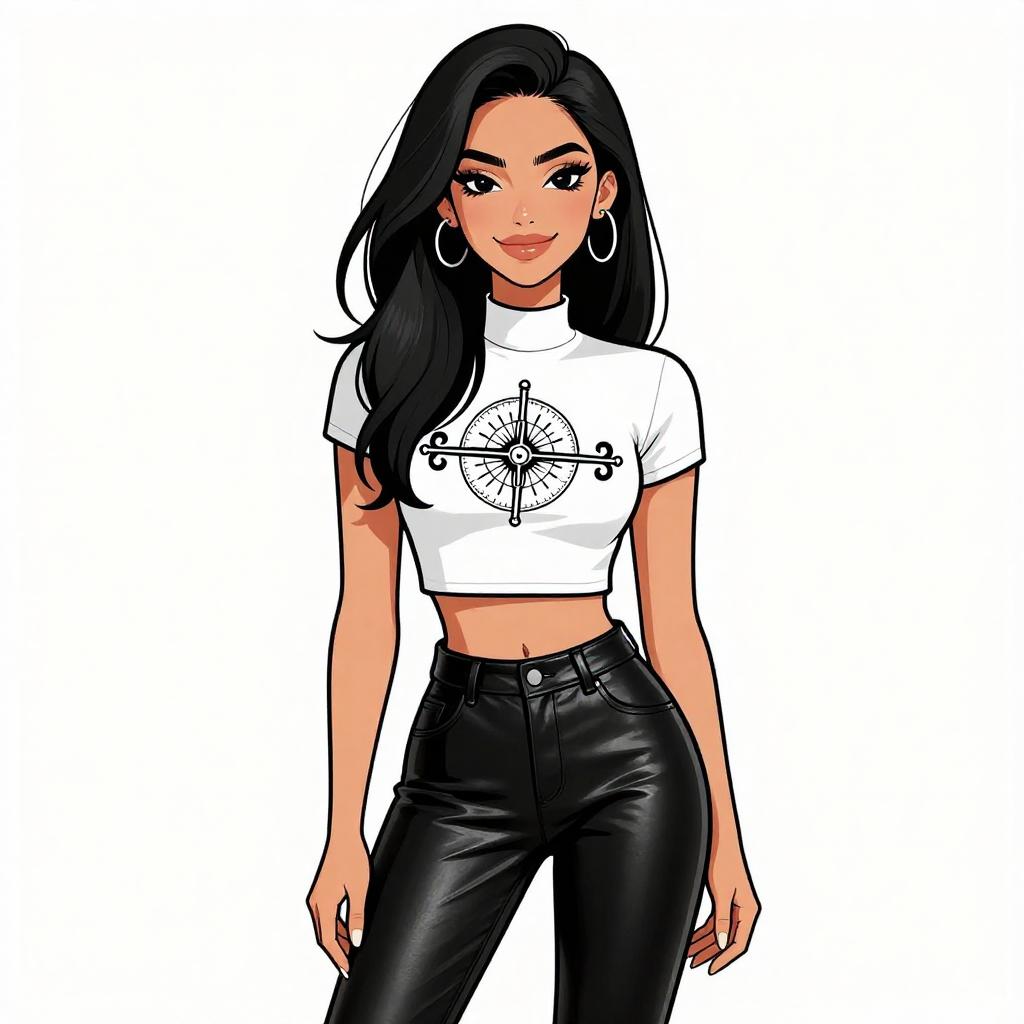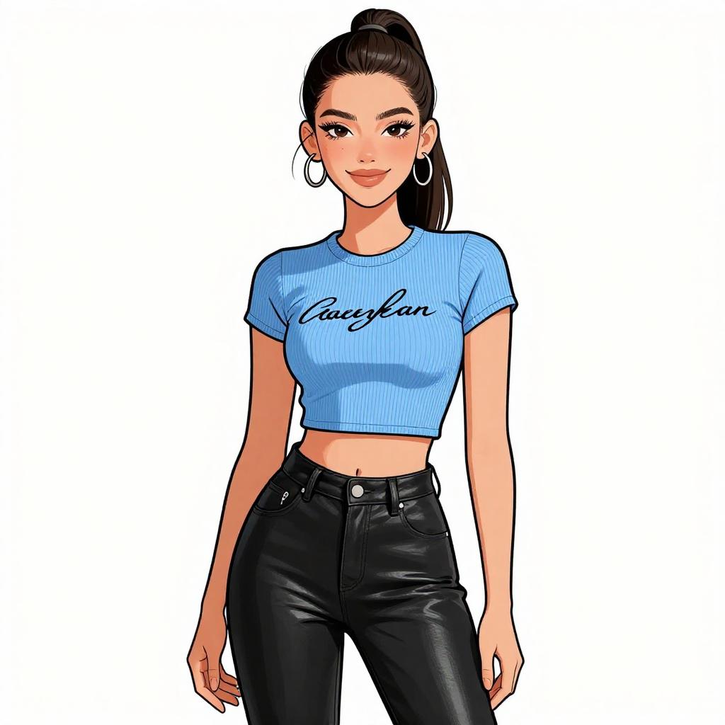 Digital illustration of a young woman with a high ponytail, wearing a light blue crop top, black leather pants, and large hoop earrings. Text "