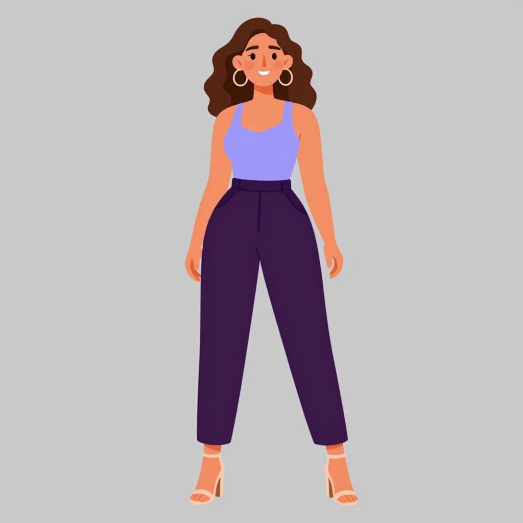 Digital illustration of a smiling woman with wavy brown hair, wearing a light purple tank top, high-waisted dark purple pants, and beige open-toed heels. She has large hoop earrings and stands against a plain gray background. Her pose is relaxed, with one hand slightly bent at her side. The art style is modern and colorful, with clean lines and a slight cartoonish feel.