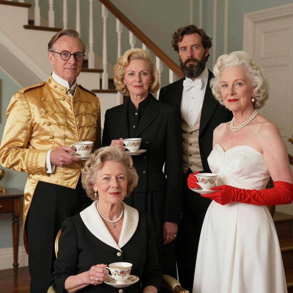 Photograph of a historical scene. Foreground: pale-skinned woman with dark hair, black velvet dress, serious expression. To her right: man with glasses, white military uniform, red and gold medals, slightly nervous expression. Background: two men, one in beige robe, one with headband, focused expressions. Dimly lit, ornate background.