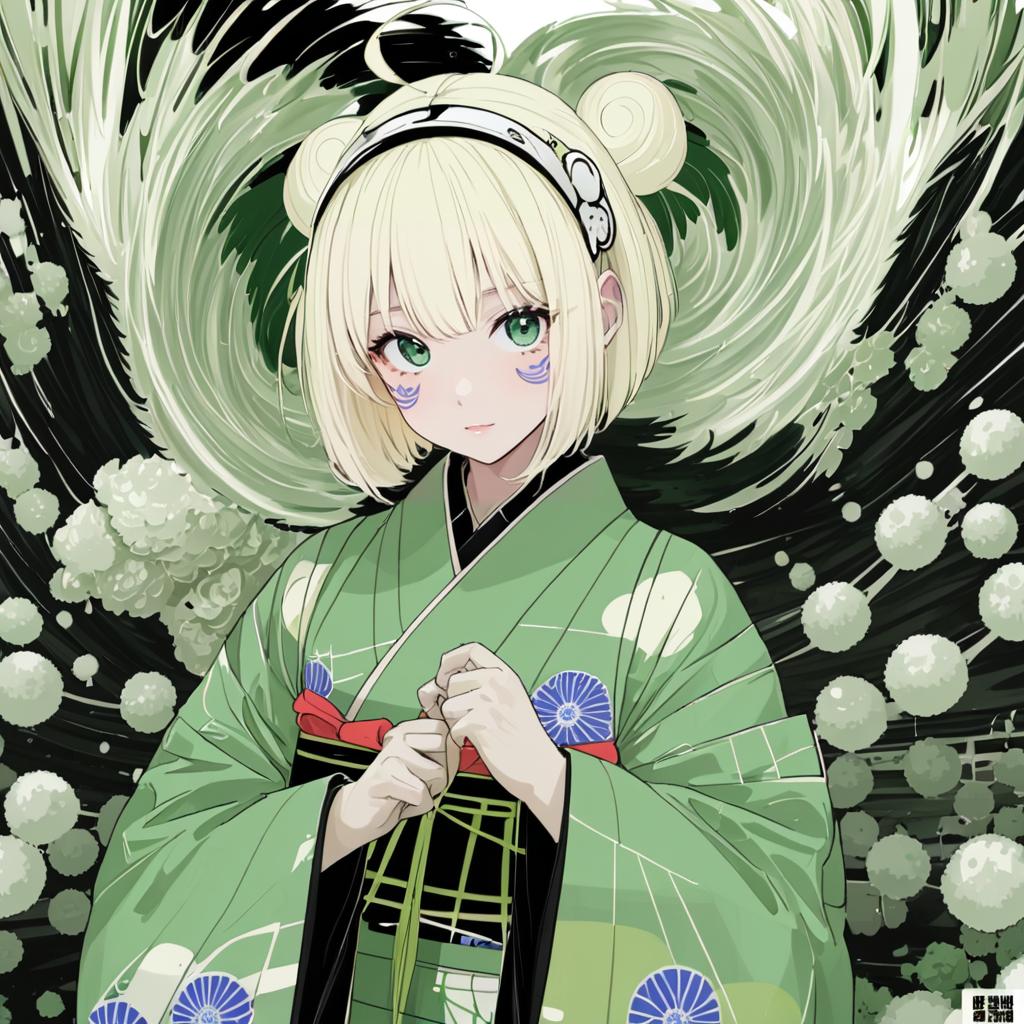 Moriyama shiemi, ao no exorcist, 1girl, green eyes, blonde hair, short hair, ahoge, hairband, kimono, by artist dishwasher1910, anime