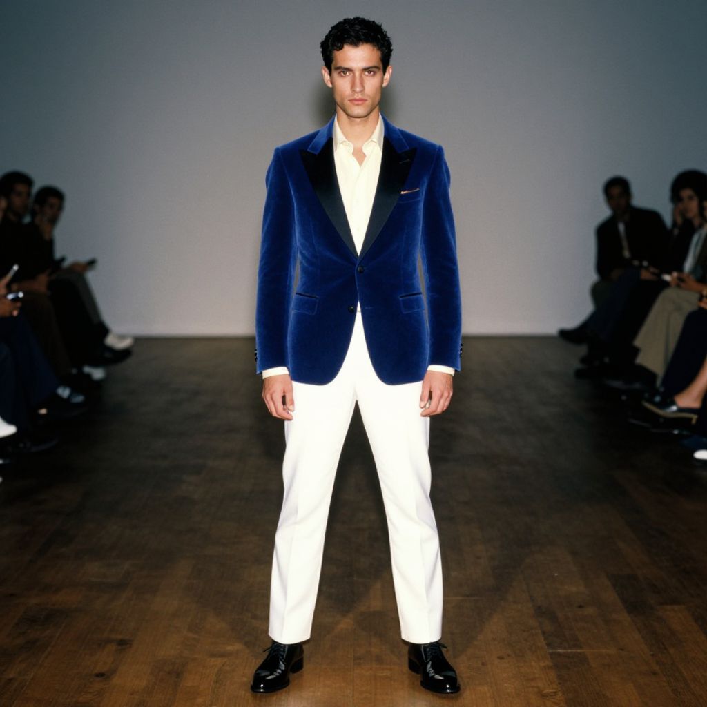 A man, royal blue velvet blazer, ivory dress shirt, tailored white trousers, black patent leather shoes, contrasting lapel detail, runway stretching into the horizon, instant film style, confident expression Man has masculine face and piercing eyes