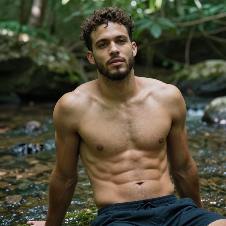 Rhys Hoskins shirtless, casual photo shoot in nature, relaxed pose by a forest stream, toned upper body, natural light filtering through leaves, soft shadows, photorealistic detail
