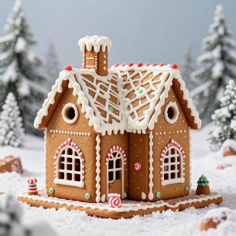 A whimsical gingerbread mansion emerges from a snowy landscape, its ornate architecture adorned with piped frosting and candy details, defying the boundaries between edible art and fantastical engineering.