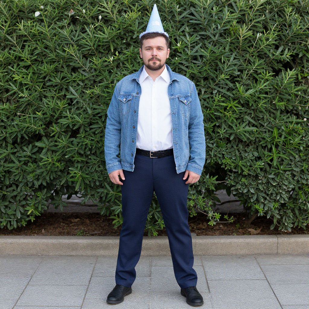 "birthday outfit man costume, 1boy, solo, male focus, party hat, shirt, pants, jacket, hat, facial hair, white shirt, belt, standing, blue pants, full body, outdoors, collared shirt, open jacket, plant, blue jacket, denim, beard, brown hair, open clothes, shoes, mustache, long sleeves, jeans, looking at viewer, black footwear Realistic photo of casual sexy person with pretty face"