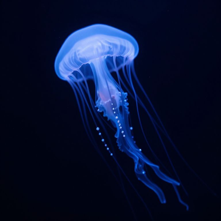 Bioluminescent jellyfish gracefully drifts through the deep, dark ocean, its translucent body glowing with ethereal blue light as delicate tentacles cascade downward, adorned with shimmering, pearl-like beads.