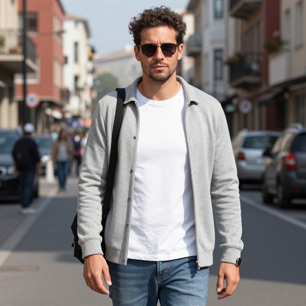 Casual street outfits, european man in a trendy yet comfortable look, set against a vibrant city background with natural sunlight and authentic textures