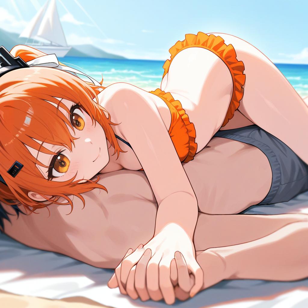 Illustration of an anime-style girl with orange hair tied in pigtails, wearing an orange ruffled bikini, sitting on a sandy beach by the sea. The background includes clear blue water, gentle waves, and sailboats under a sunny sky.