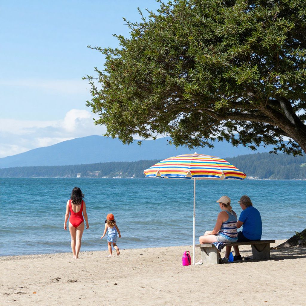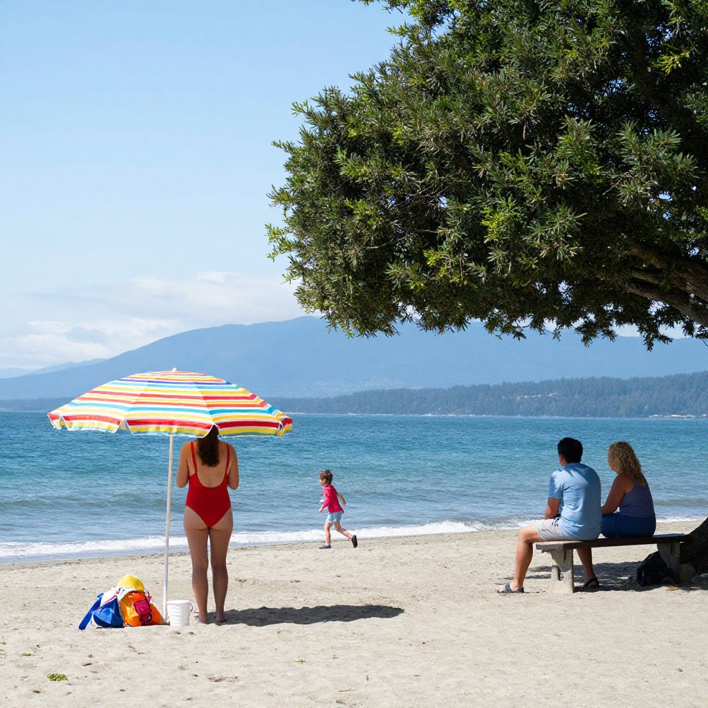 Summer day at Long Beach, Vancouver Island, featuring a vibrant beach scene with a colorful striped umbrella casting shade over a woman in a red swimsuit, a child running towards the water, and two people sitting on a bench under the shade of lush green trees, all set against a serene backdrop of turquoise ocean and distant mountains.