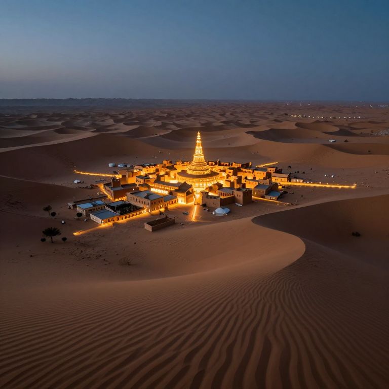 A vast desert where the sand glows and shifts into miniature cities at night, vanishing with the dawn.