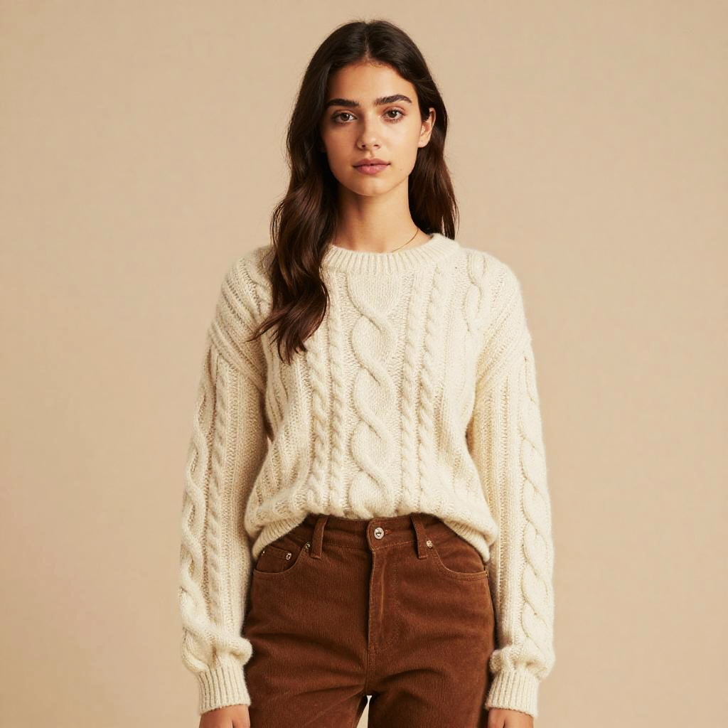 Young Woman in Cream Cable-Knit Sweater and Brown Corduroy Pants