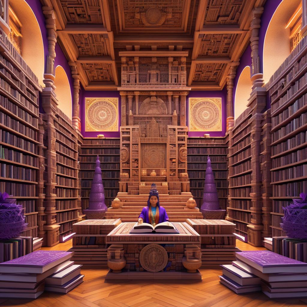 Detailed Aztec-style carving of a scholar seated on a throne surrounded by a vast library with intricately designed bookshelves. The statue and library architecture feature a purple and terracotta color scheme, inspired by a blend of historical Aztec art and modern fantasy aesthetics. The scholar wears traditional Aztec attire and a headpiece, holding an open book while sitting on steps under an ornate arch.