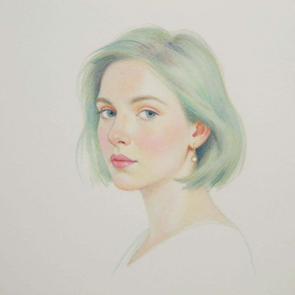 Digital watercolor portrait of a fair-skinned woman with short, light green hair, blue eyes, and pink lips, looking to the side. White