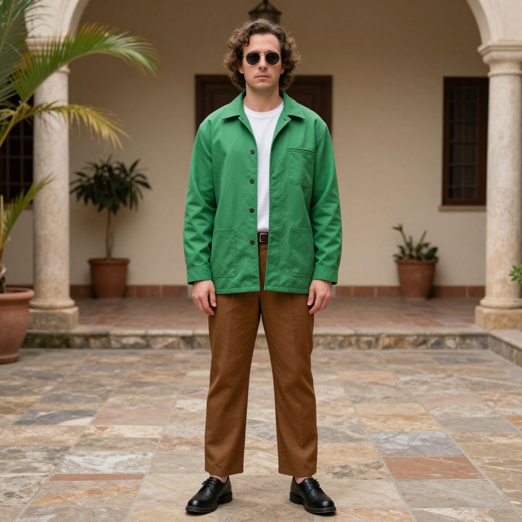 Man Hipster Clothing Costume, man in a green jacket and brown pants standing in a courtyard