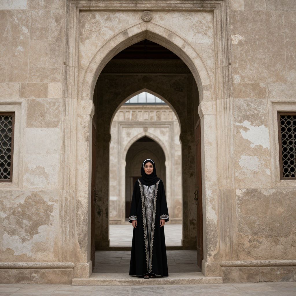Graceful Woman at Ancient Mosque Entrance