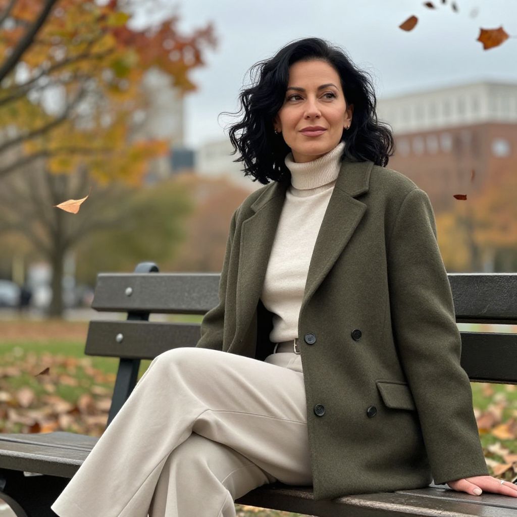 A confident woman in her 40s with wavy black hair and a kind facial expression sitting on a bench in a downtown park during early fall, wearing a cozy oversized olive blazer, a cream-colored turtleneck, and a pair of wide-legged beige trousers, with the background showing colorful leaves drifting on the wind and a faint autumn sky.