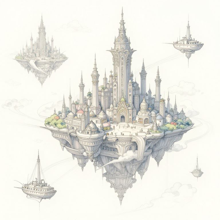 Fantasy sketches portraying an expansive floating city in the sky with elaborate towers, flying ships, and cloud pathways, delicate and precise line work paired with soft pastel colors, creating a surreal and majestic aerial fantasy metropolis.