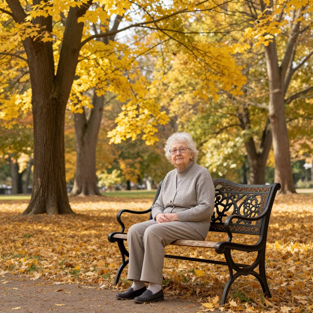 Elderly woman seated on a classic wrought iron bench amidst a vibrant autumn park, surrounded by golden leaves and towering trees with sunlight filtering through the foliage.