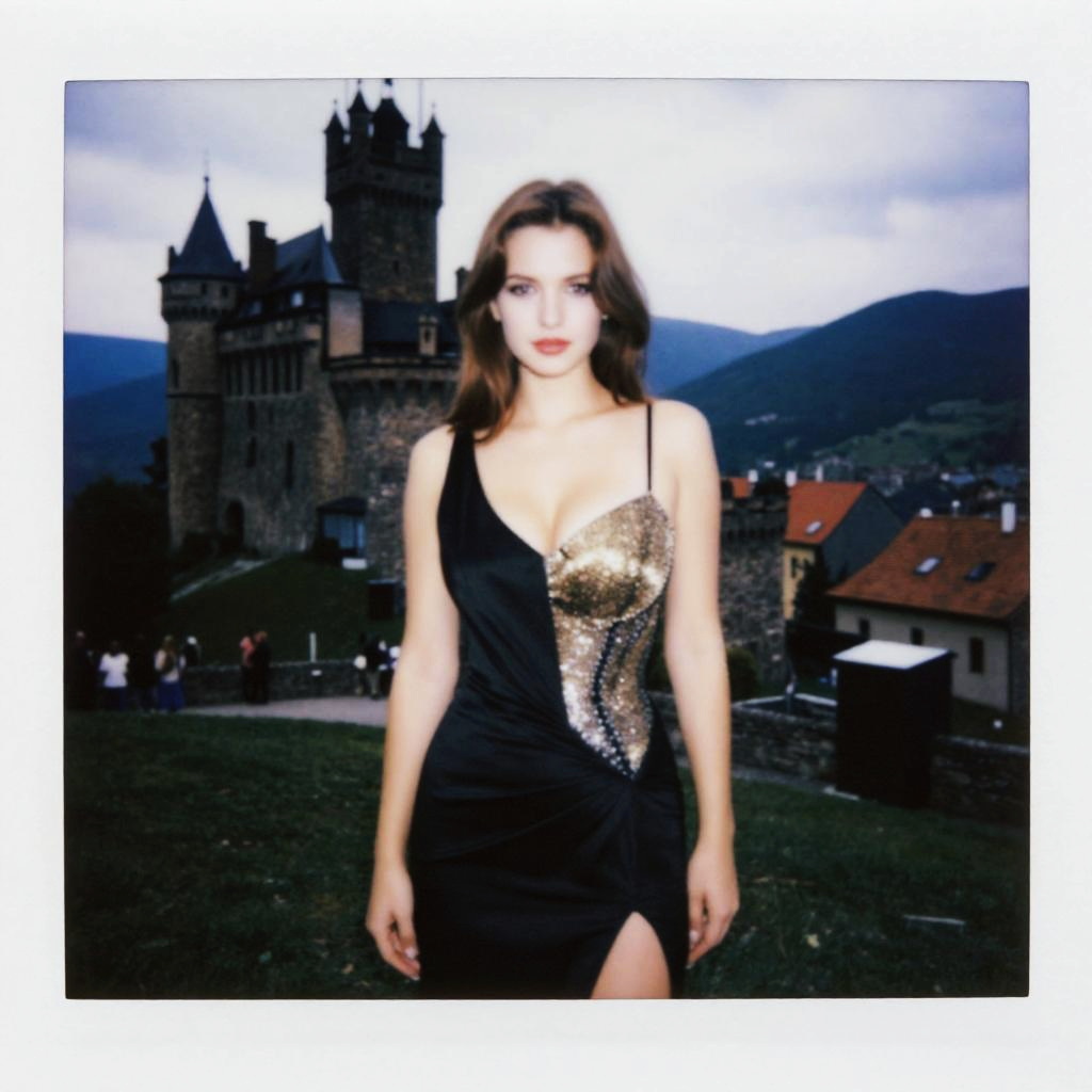 A busty woman in an asymmetrical black evening dress with a sparkling gold panel, standing in a historical castle in the Carpathian Mountains. Visual style: polaroid instant camera. Sexy. Pretty face and beаutiful eyes. Big breasts