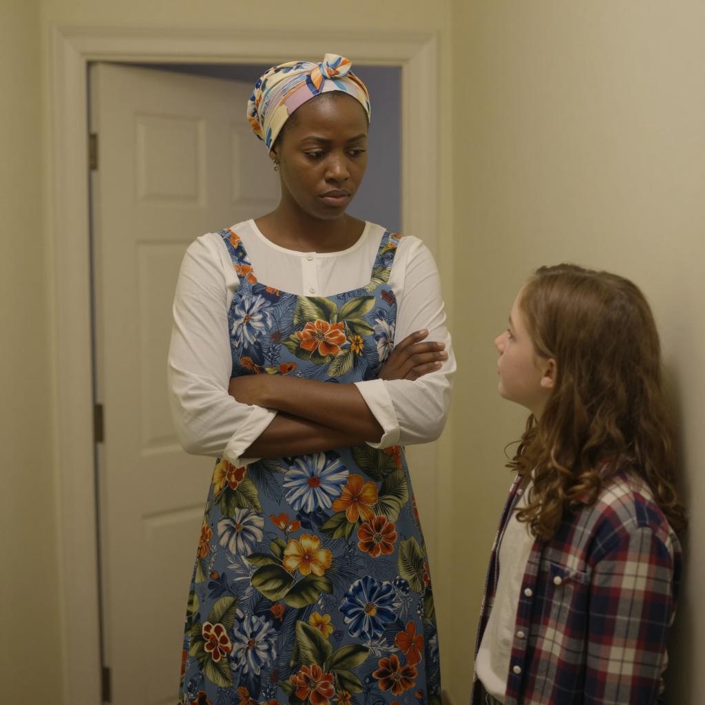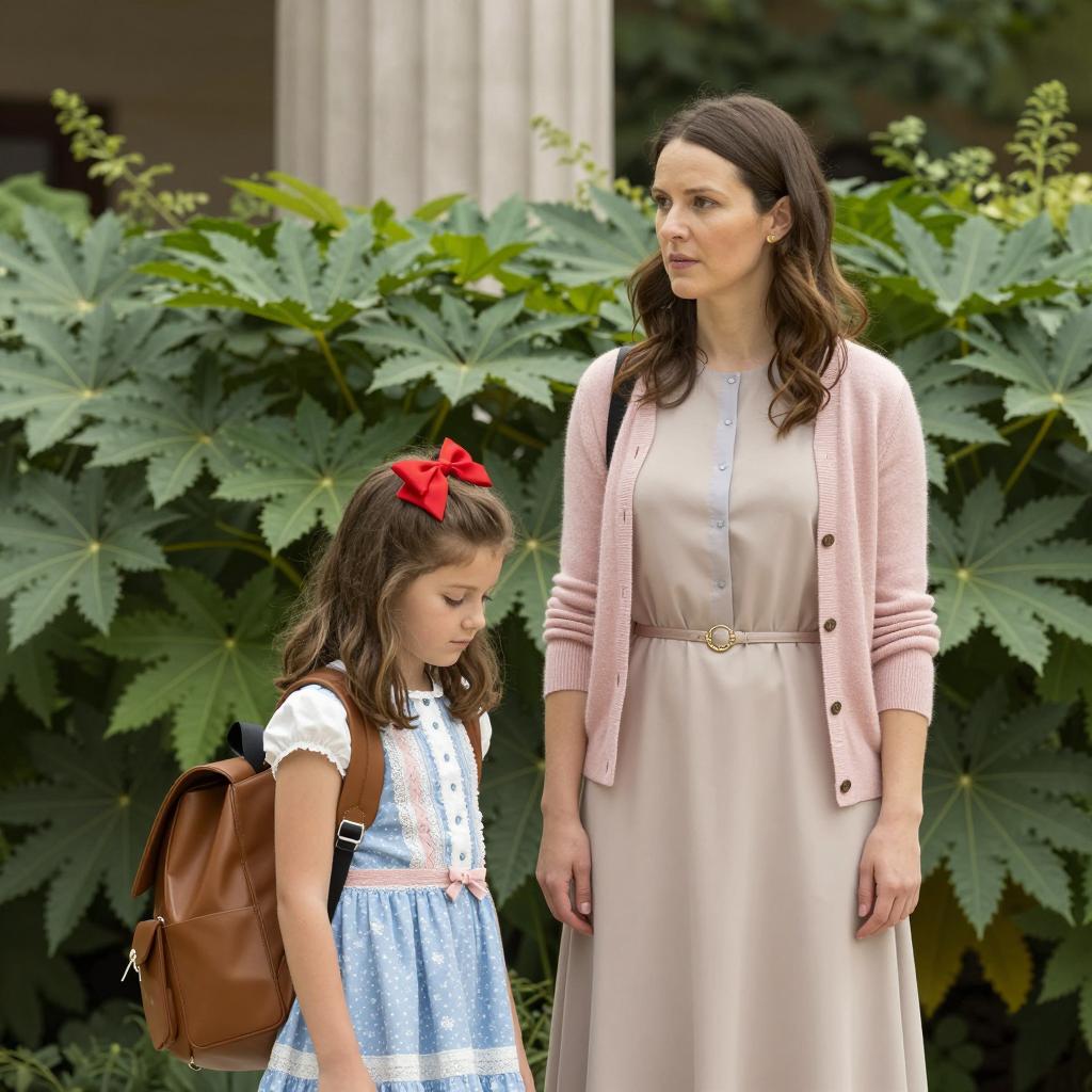 Two women standing in dense green foliage. Adult woman with brown hair in a pink cardigan and beige dress, looking to the side. Young girl with brown hair in a red bow, blue and white dress, and brown backpack, looking down. Tall stone column in background. Bright daylight.