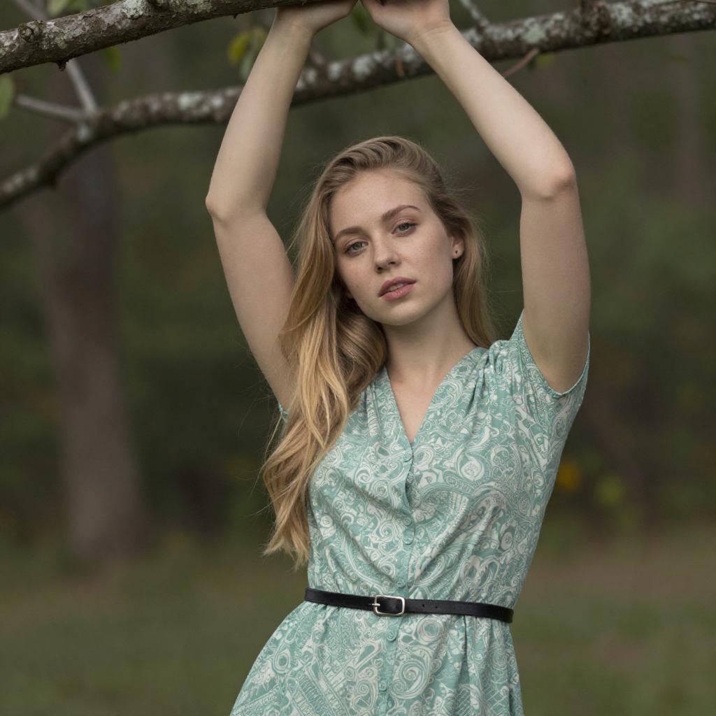 Photograph of a young woman with long, blonde hair, wearing a light green, patterned dress with short sleeves and a black belt. She stands outdoors, arms raised above her head, gripping a tree branch. The background features a forest with blurred trees and foliage. Her expression is calm, with slightly parted lips and subtle makeup.