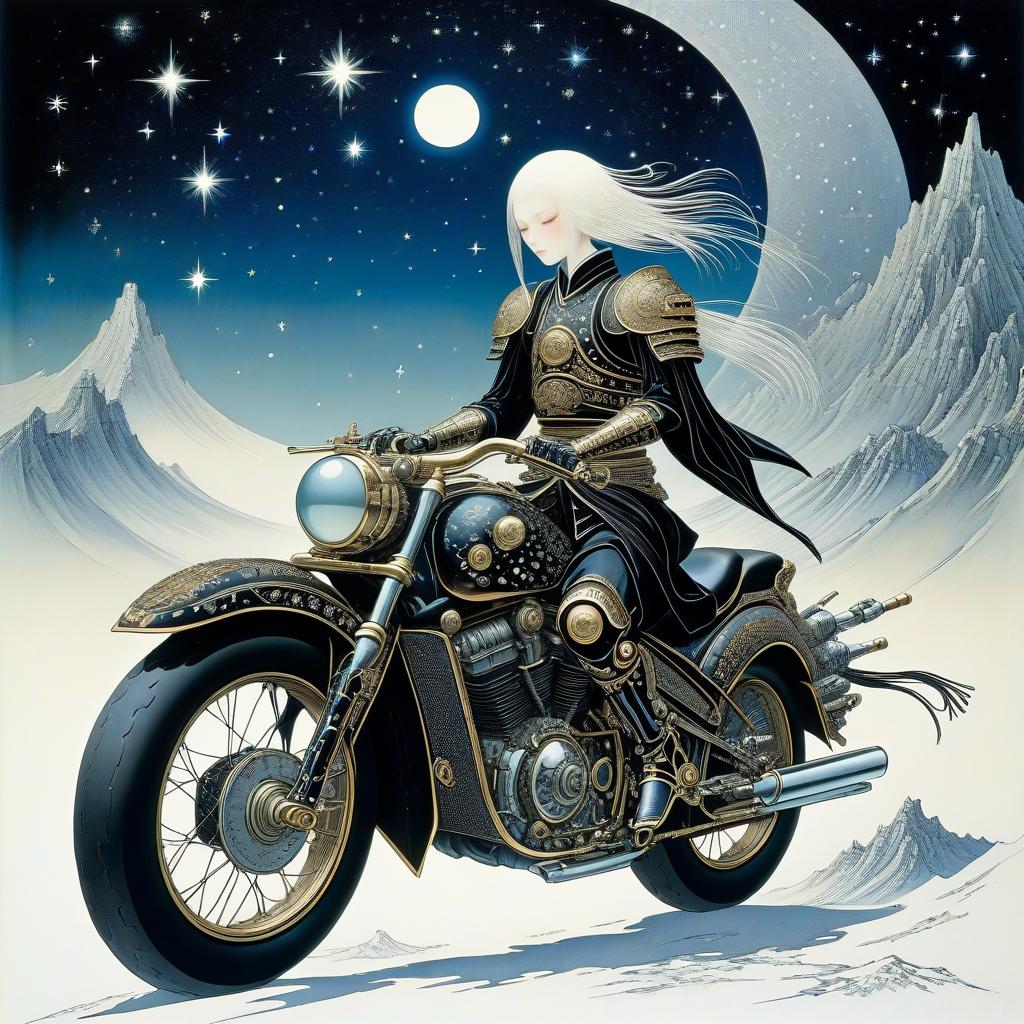 Kay Nielsen, surreal, mysterious, strange, fantastical, fantasy, sci-fi, Japanese anime, cosmic stars, motorcycle, samurai armor, perfect voluminous body, detailed masterpiece.