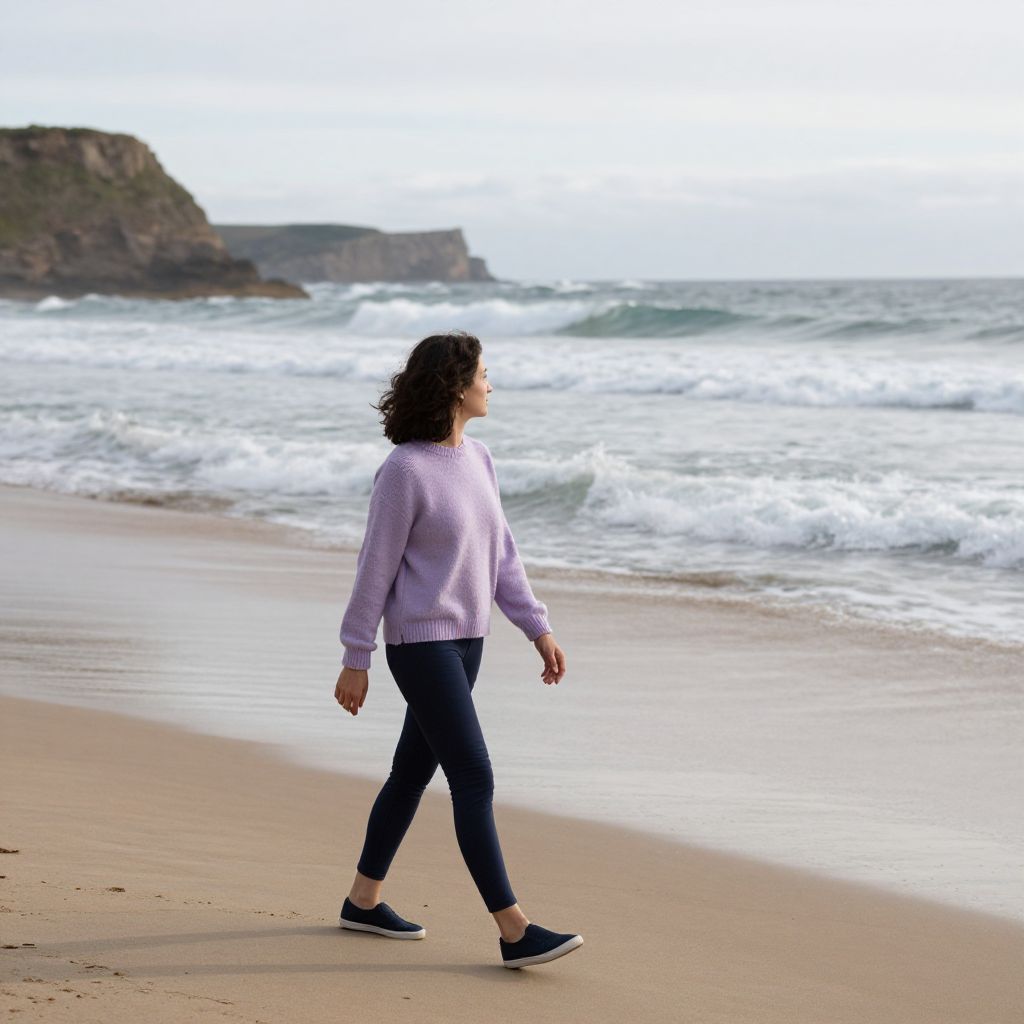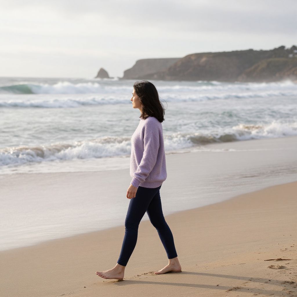 Solemnly strolling along the sandy shoreline, a woman in a lavender sweater and navy leggings enjoys a tranquil moment by the ocean, her silhouette framed against the rolling waves and distant cliffs under a soft, overcast sky.