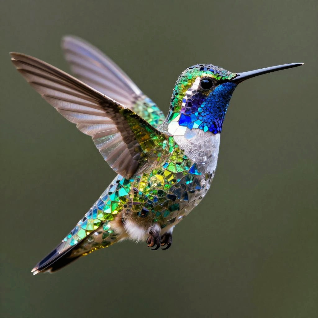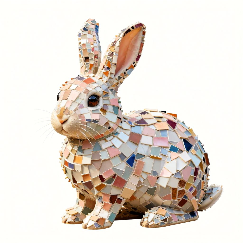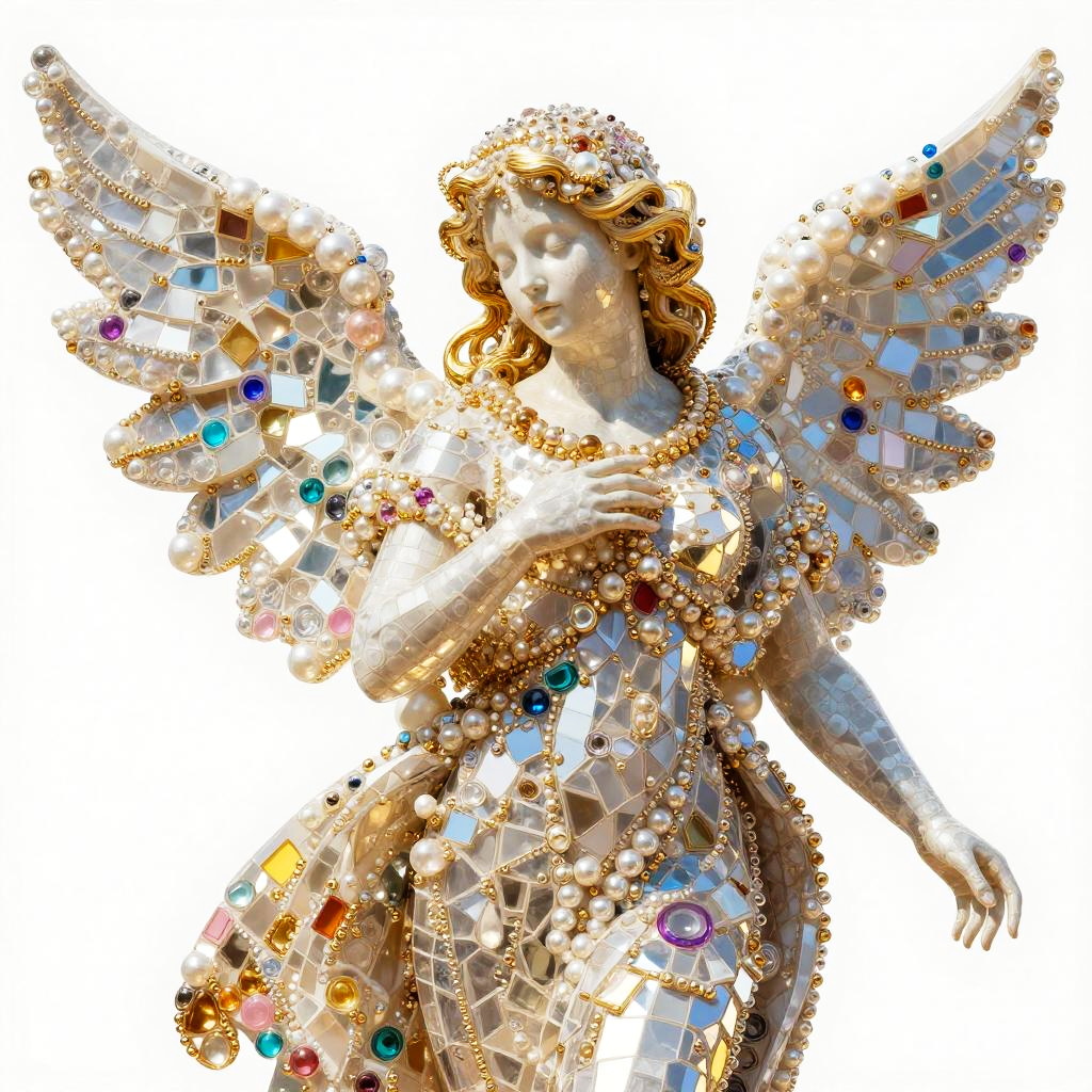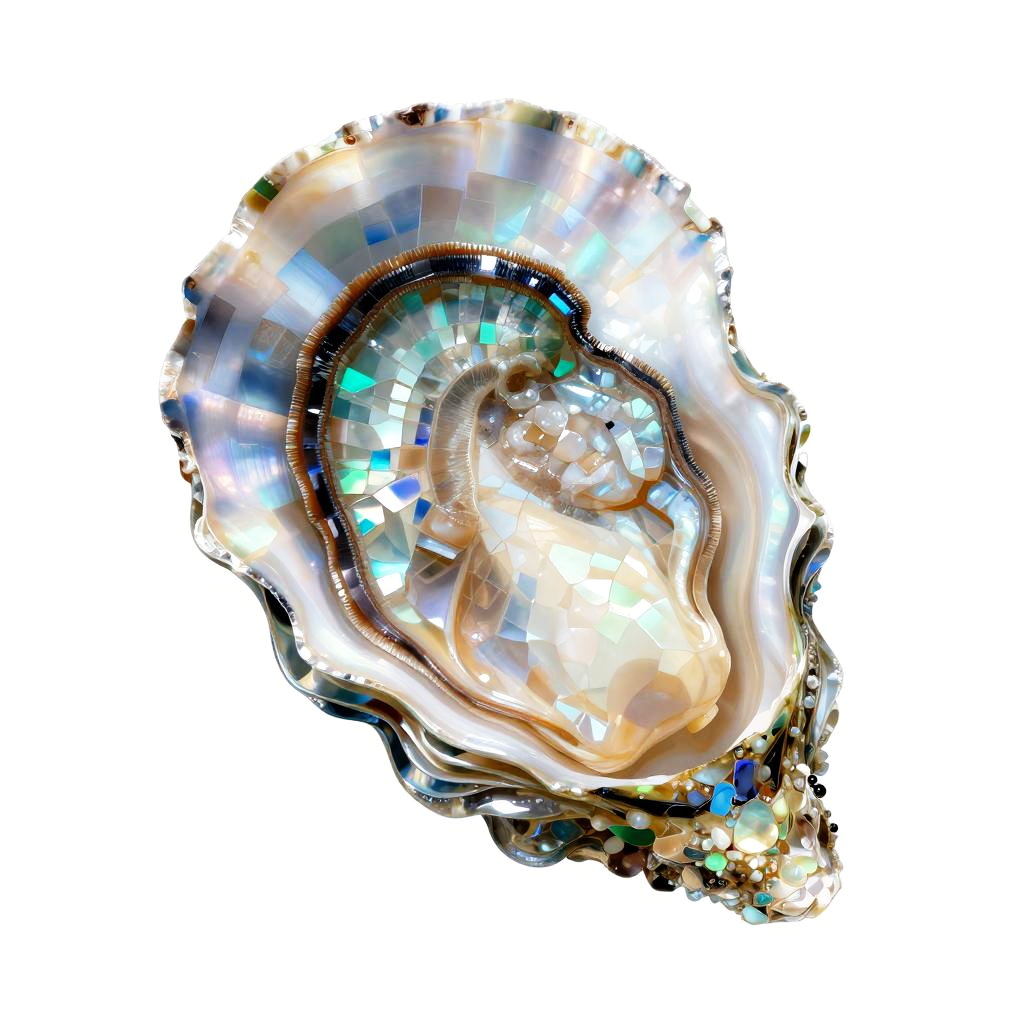 A detailed digital artwork featuring a graceful pearl oyster composed of a mosaic of small, colorful mother-of-pearl shards that form a fragmented, pixelated effect. The subject is portrayed in a oceanic style, with carefully arranged blocks creating depth and definition. The color palette is vibrant, including shades of ivory, seafoam green, light blue, silver that reflect light, giving the artwork a luminous quality.
