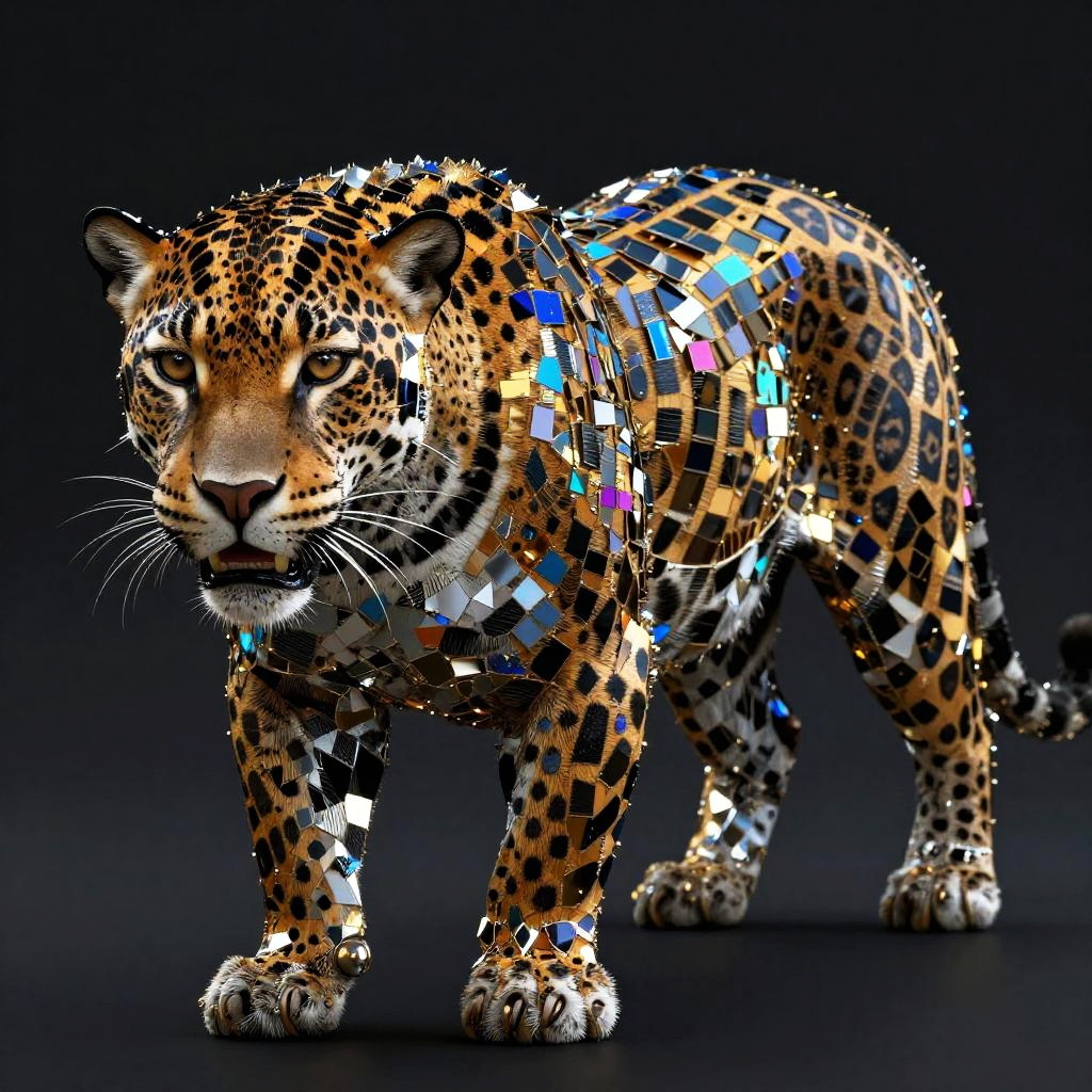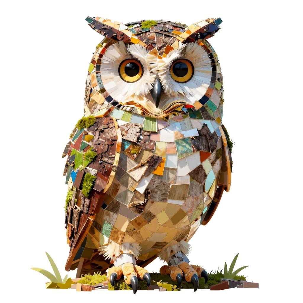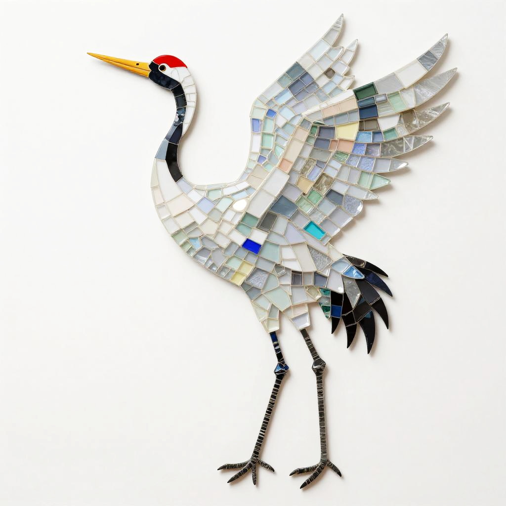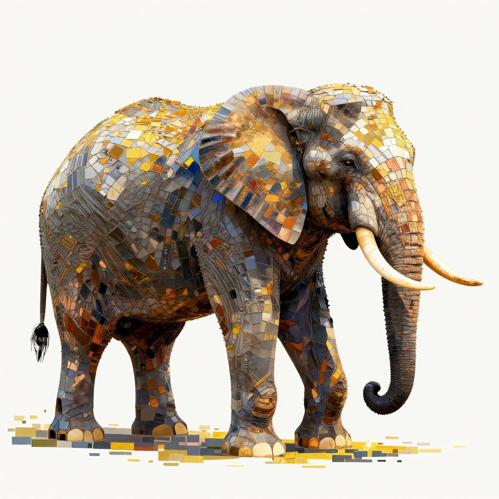 A detailed digital artwork featuring a graceful pearl oyster composed of a mosaic of small, colorful mother-of-pearl shards that form a fragmented, pixelated effect. The subject is portrayed in a oceanic style, with carefully arranged blocks creating depth and definition. The color palette is vibrant, including shades of ivory, seafoam green, light blue, silver that reflect light, giving the artwork a luminous quality.
