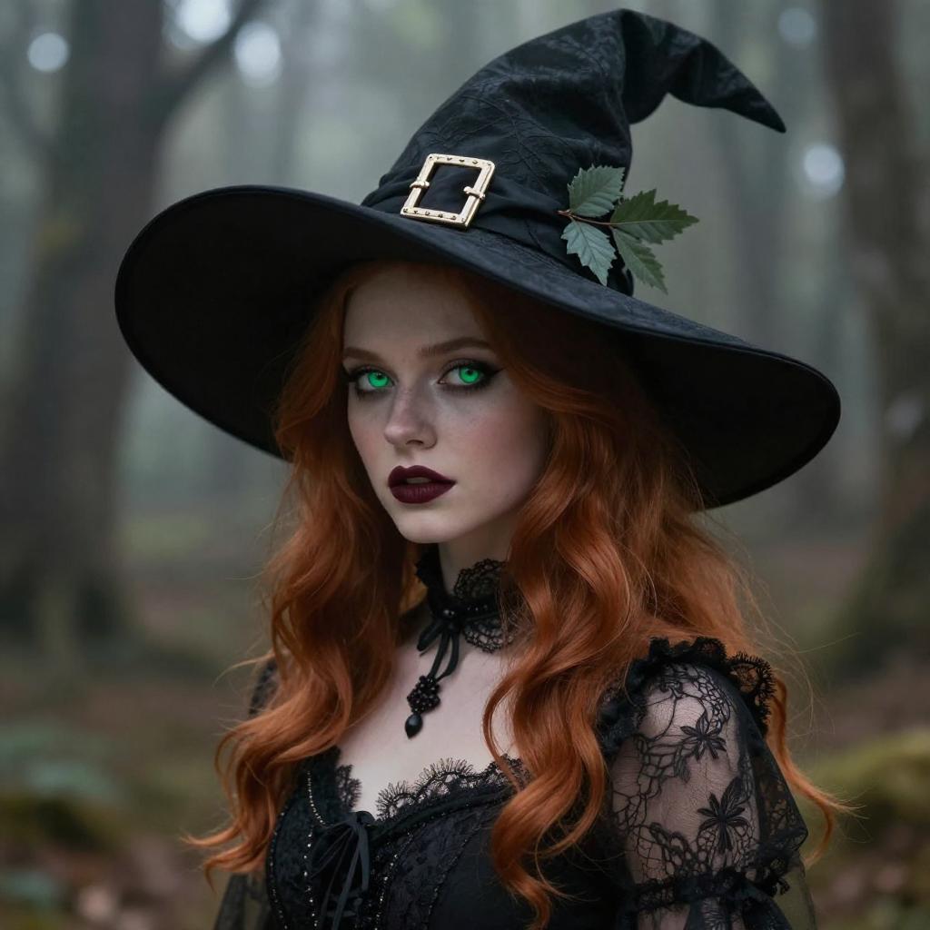 Halloweenglowstyle, city, custom, witch, 25 year old girl, (elf), (Red-headed:1.4), almond eyes, green eyes, long hair, [curly hair], eye shadow makeup, 162cm tall, oval face, snub nose, heart-shaped lips, arched eyebrows, (full body:1.5), (masterpiece, High quality, best quality:1.4), sharp focus, (intricate, detailed:1.3), (Cinematic lighting), (detailed scenery, epic scenery), (official style, official art, official wallpaper), (everything Detailed)