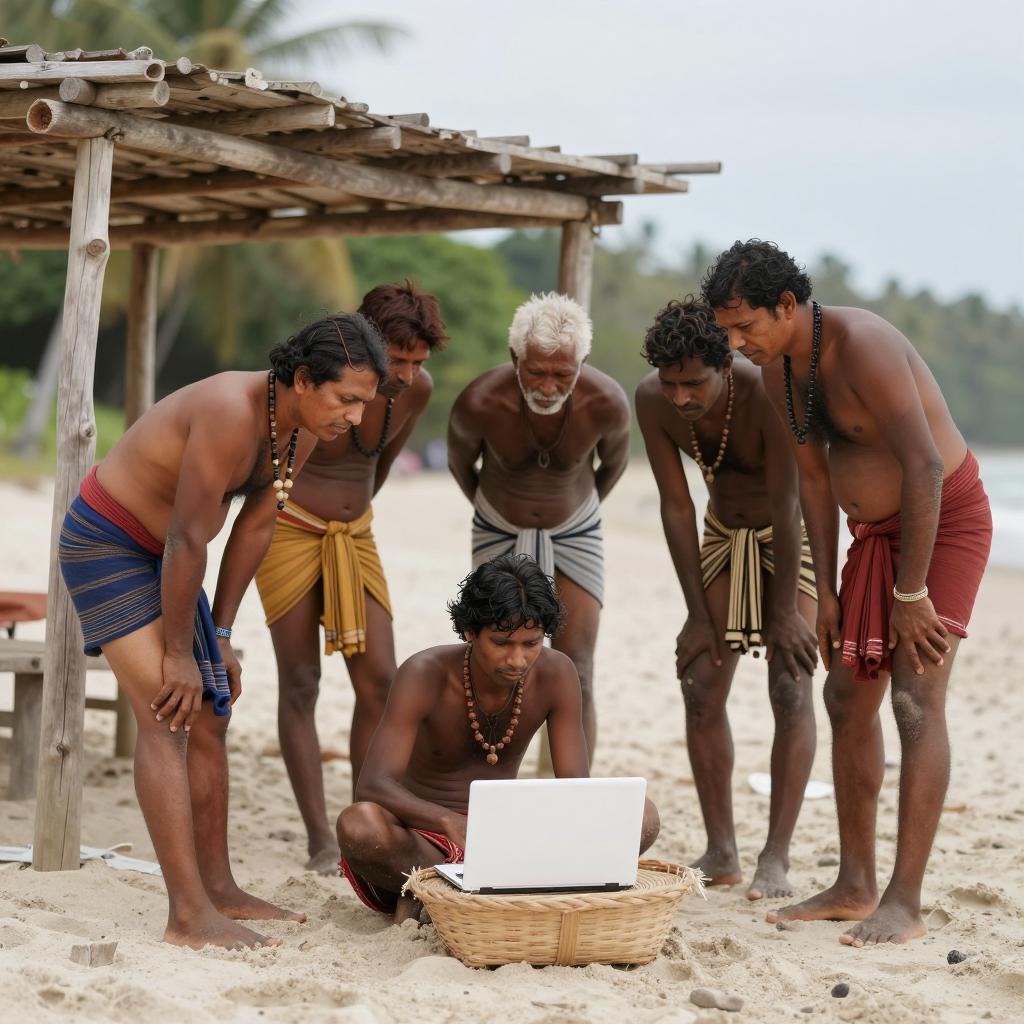 Native men with dark hair, bare-chested, wearing loincloths and necklaces, gather around a white laptop on a sandy beach. One man stands with legs apart, others lean or bend. Wooden shelter in background, laptop on a woven basket. Six men total, one with hands on hips, others focused on laptop. Greenery in the distance.