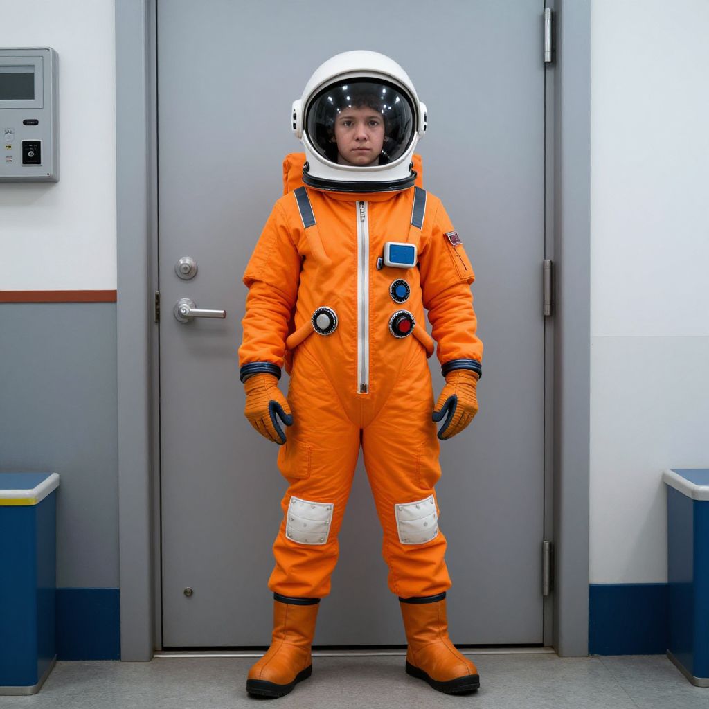 Photograph of a young child in an orange astronaut suit with white helmet, standing in front of a gray door, inside a sterile room with blue and