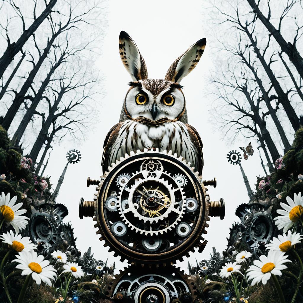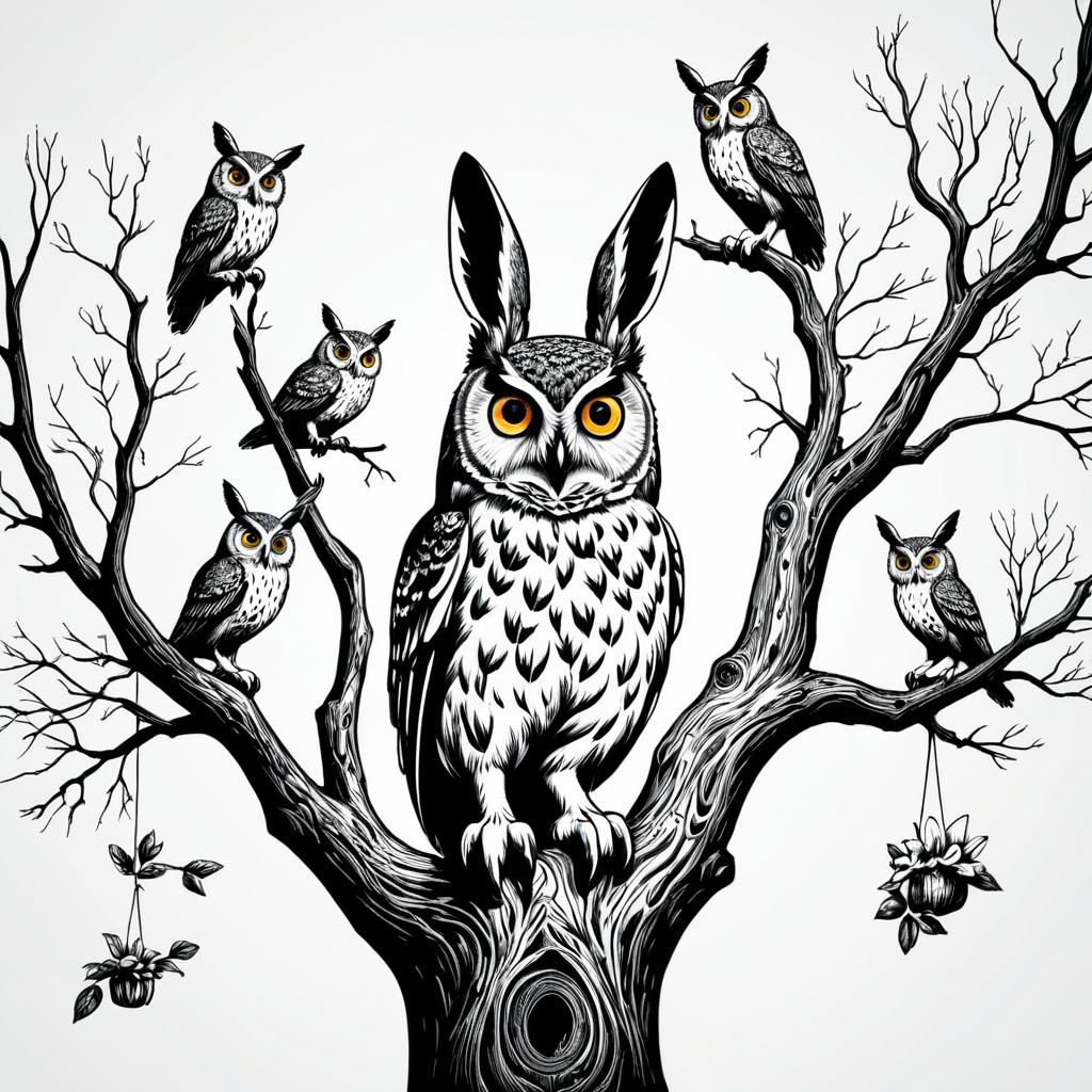 Wide-angle depth of field, elf in line art, on a white background. The bunny features surreal details like emerald glowing eyes, in unusual positions like floating upside down. The background is a dreamlike, distorted landscape with surreal elements like floating trees and giant flowers, rendered in 9:16 aspect ratio.