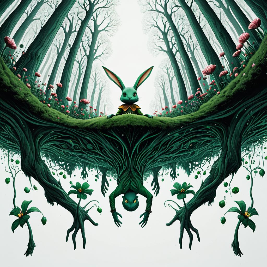 Wide-angle illustration featuring a surreal elf and bunny with emerald glowing eyes in a distorted, dreamlike forest environment. The scene includes floating trees, moss-covered surfaces, and giant flowers, creating a fantasy atmosphere with unusual, upside-down and floating elements. The background is minimal white, enhancing the vibrant green and pink colors of the forest and characters.