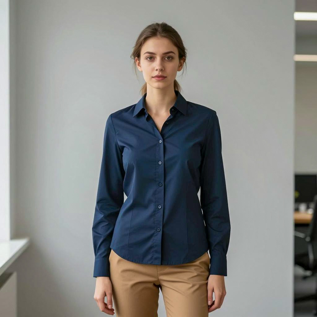 Long sleeve formal dress, photo of a woman, standing in a fancy room, wearing a white button-up shirt, black skirt, chandelier above, elegant curtains, gold trim, green plant in background, medium length dark hair, serious expression, realistic, well-lit, portrait, formal attire