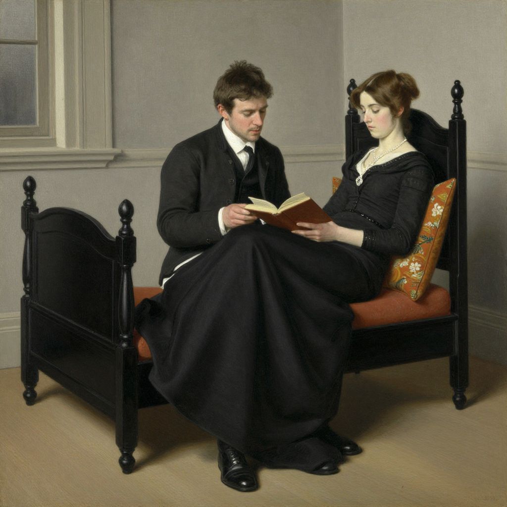 This is a digital painting depicting a Victorian-era couple sitting on a black, wooden, four-poster bed in a dimly lit room with grey walls. The woman, with light brown, wavy hair, wears a strapless, grey dress and a black skirt, and reads a book. The man, with dark brown, curly hair, is dressed in a black suit with a white shirt and black bowtie, also reading a book. A brown cushion is placed between them. A framed picture hangs on the left wall. The floor is wooden. The image has a realistic, slightly romanticized style.