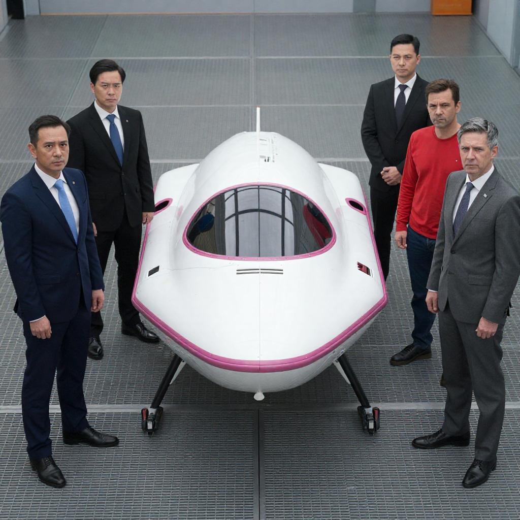 Photograph of five men standing around a white futuristic spacecraft with pink accents and black landing gear. Three men wear black suits, one man wears a red long-sleeve shirt and dark pants, and another man wears a gray suit with a blue tie. The scene is set on a metal grid floor under bright lighting in a high-tech environment. The men have intense expressions, highlighting a serious and professional atmosphere.