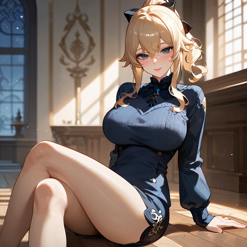 Score_9, score_8_up, score_7_up, source_anime, anime screencap, best quality, masterpiece, detailed, highres, ultra hd quality details, hyper resolution, crystal clear textures, perfect shadows, perfect lighting, best reflections, beautiful, extreme detailed face, perfect skin textures, expressive eyes, perfect face, bloom, lens flare, godrays, beautiful background, jean gunnhildr, jean_(genshin impact), blonde hair, ponytail, blue eyes, big breasts, (sweater, crossing legs), bare legs, sitting, looking at viewer, blush, loving smile, closed mouth, indoors, ((night time, dark lighting)), fireplace, sitting on floor, front view, pov, bottomless
