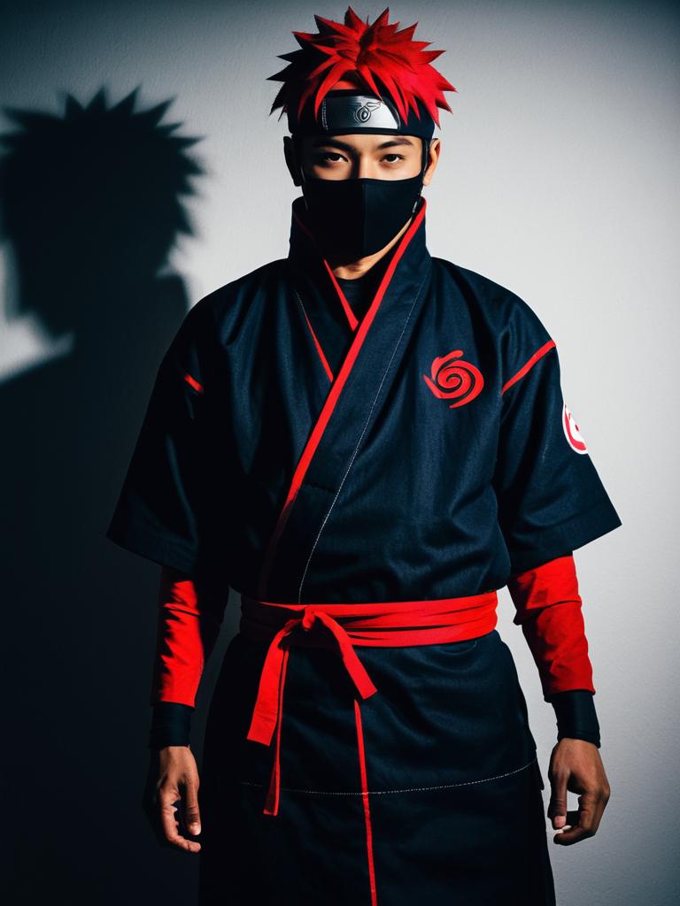 Waist-up editorial portrait of a man wearing a Naruto Akatsuki costume. The costume features a black cloak with red clouds, a red inner lining, and a red belt. The man has spiky black hair, a ninja headband with a metal plate, and a black face mask. The image showcases dramatic shadows and a plain light background.
