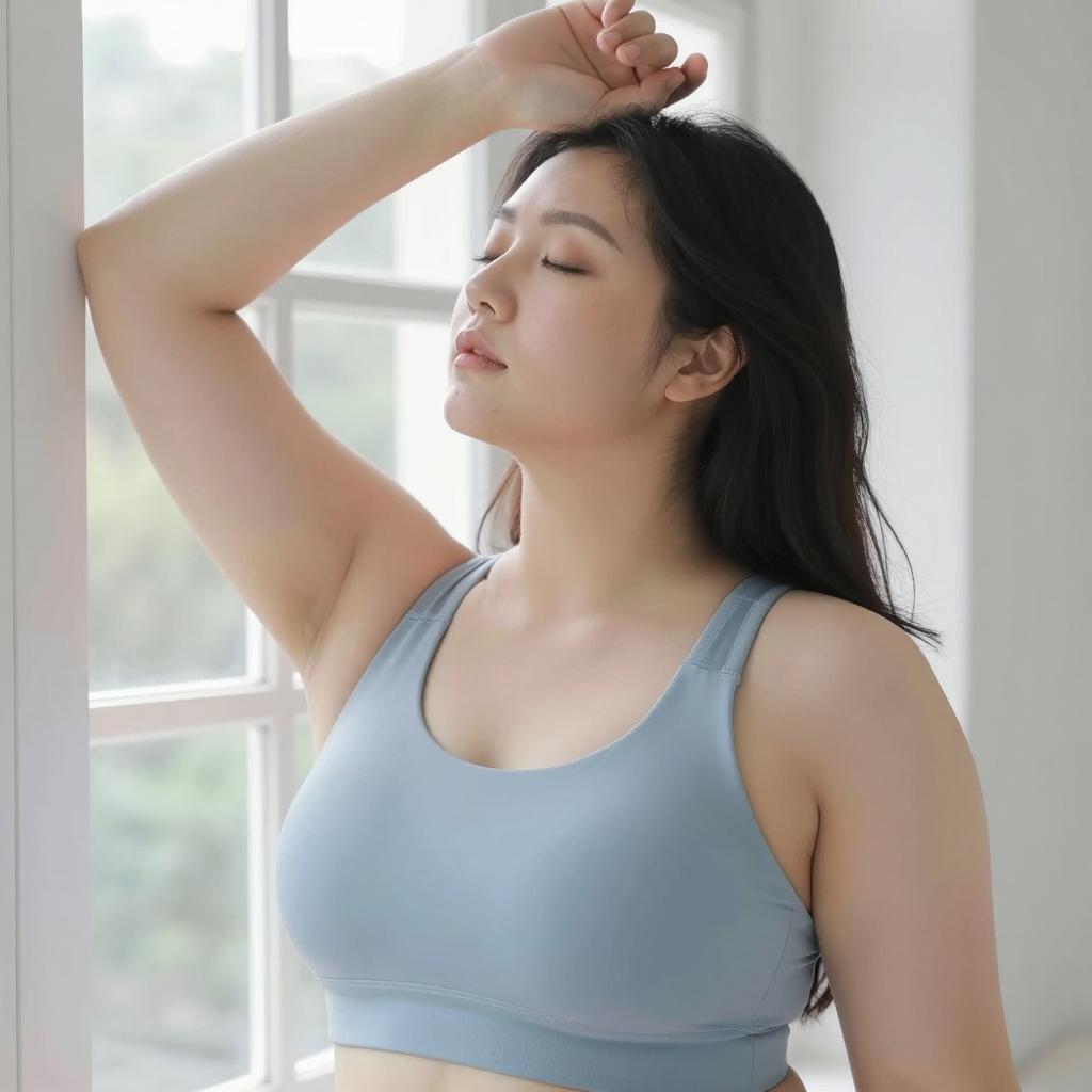 Photograph of a plus-sized woman with fair skin and long black hair, wearing a light blue sports bra. She has large breasts and is standing near a bright window, with her right arm raised and hand touching her head. Her eyes are closed, and her facial expression is calm. The background is slightly blurred with light filtering through the window.