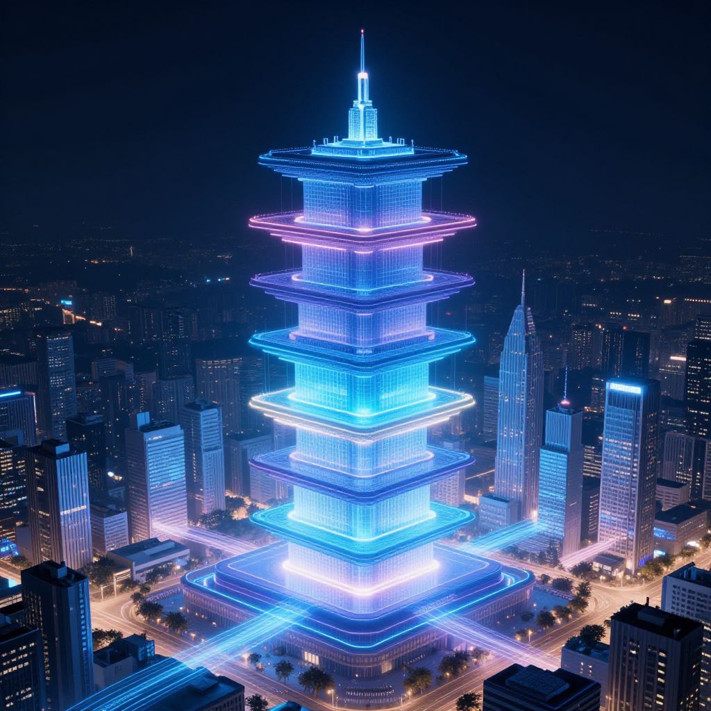Visualization of OSI model layers integrated into a futuristic cityscape, with each layer represented as different levels of a high-tech tower interconnected by streams of light, blending technology and architecture in a conceptual art style
