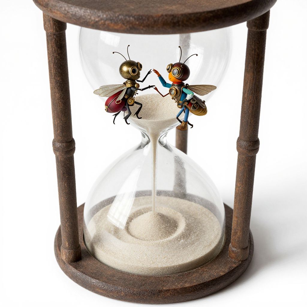 A whimsical dreamlike illustration captures a surreal scene where anthropomorphic insects wearing vintage steampunk-inspired gear dance gracefully atop a giant hourglass. Viewed from an aerial perspective, this scene showcases the intricate mechanical details and vibrant colors of their costumes against the stark white sand of the hourglass' interior. As time ebbs away, the smooth flowing sand creates a mesmerizing contrast with the insects' movement, evoking both whimsy and contemplation about life's transient nature in a style reminiscent of M.C. Escher's playful yet thought-provoking work.