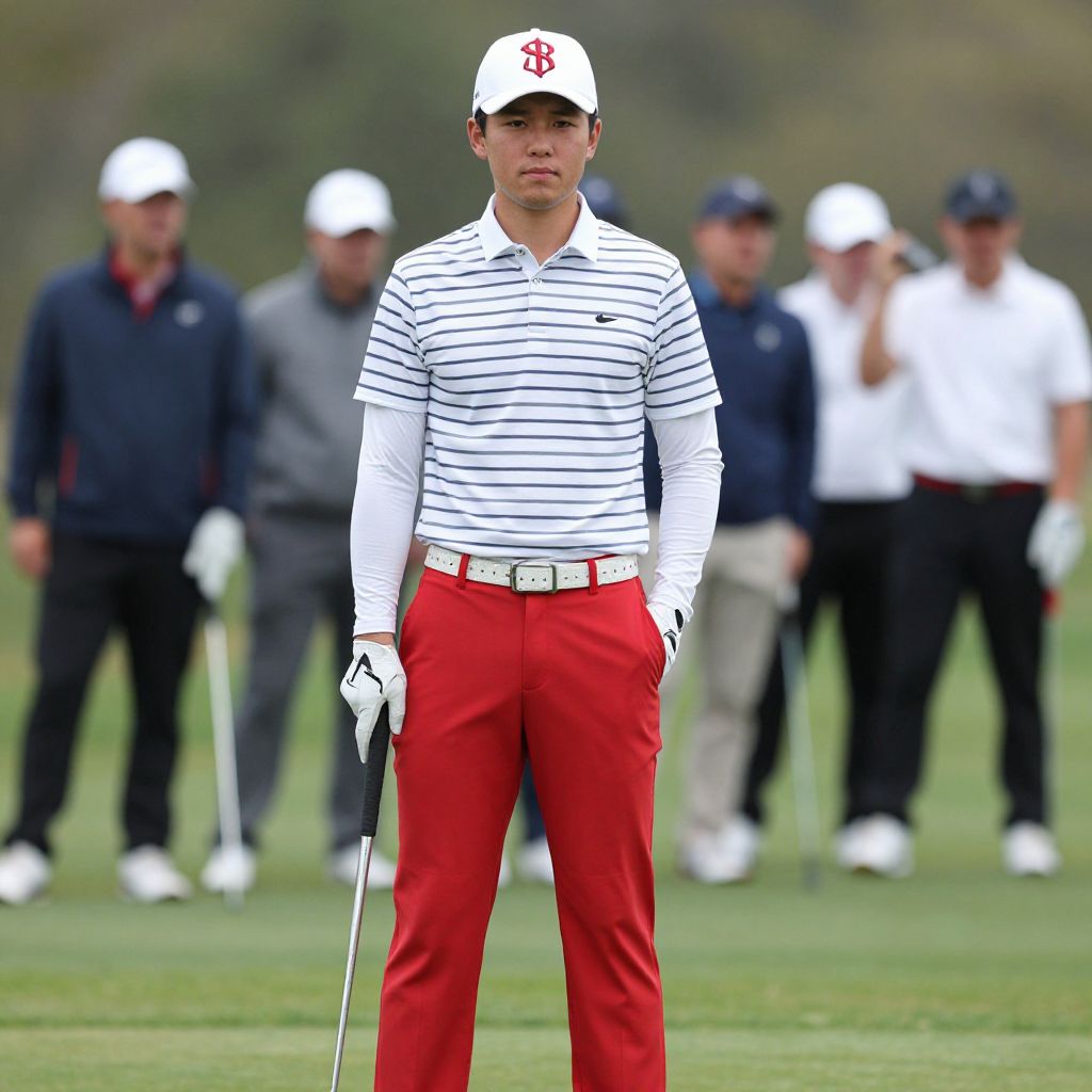 Photograph of a young male golfer standing on a green golf course. He wears a white cap with a red "P" logo, a white and black striped polo shirt, red pants, and white gloves. He holds a golf club in his right hand. His expression is focused and serious. In the blurred background, five men in white and dark blue polo shirts and caps stand, watching. The green grass and golf course are visible, with a distant, out-of-focus tree line. The image has a clear, bright, and natural light, emphasizing the golfer's attire and stance.