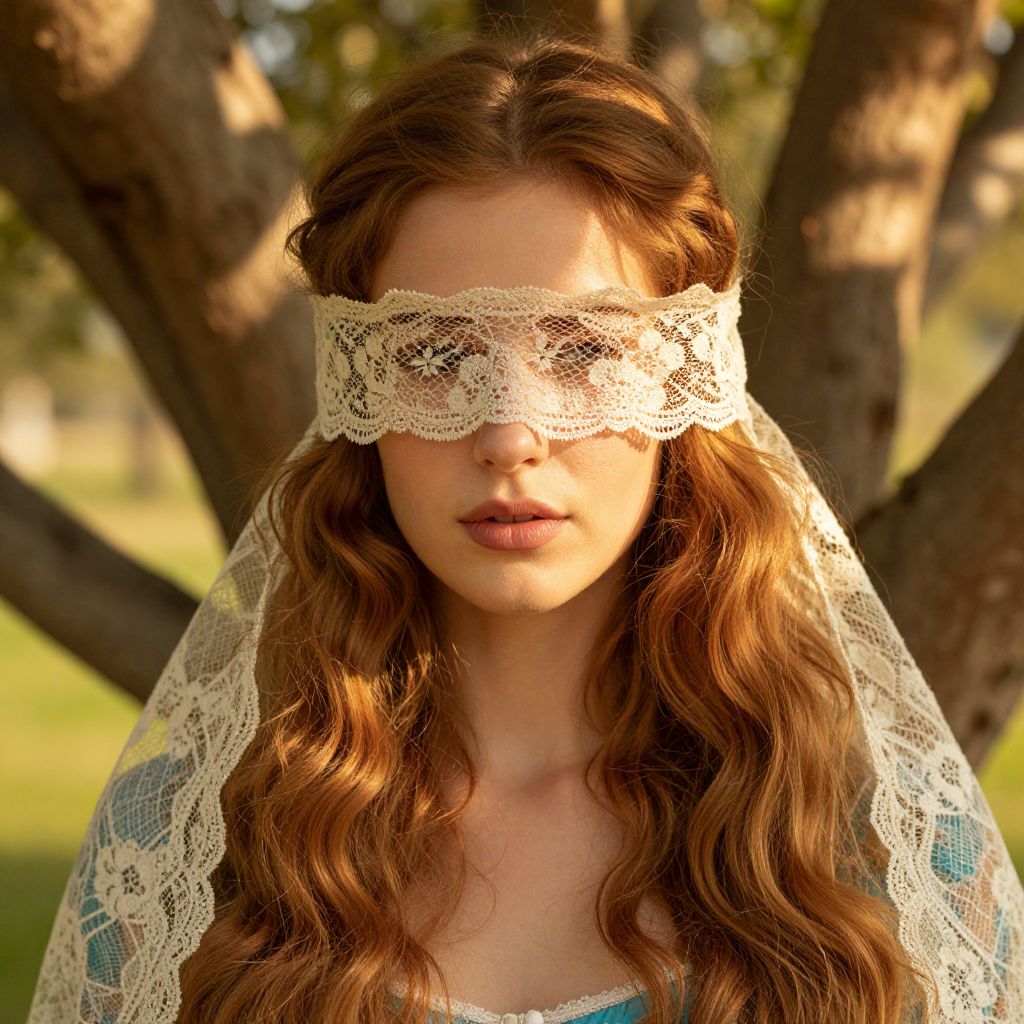 Photograph of a young woman with long, wavy auburn hair, wearing a delicate white lace blindfold that covers her eyes. She has fair skin and full, slightly parted lips. The lace blindfold and matching veil have intricate floral patterns. She is dressed in a blue and white lace garment. The background features a sunlit, blurred outdoor setting with green grass and a large tree trunk. The sunlight filters through the leaves, creating a warm, golden glow on her hair and face. The overall mood is ethereal and serene.