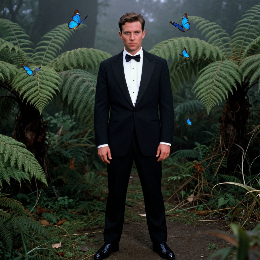 Photograph of a serious man in a black tuxedo and bow tie, standing in a misty forest with vibrant blue butterflies around green ferns