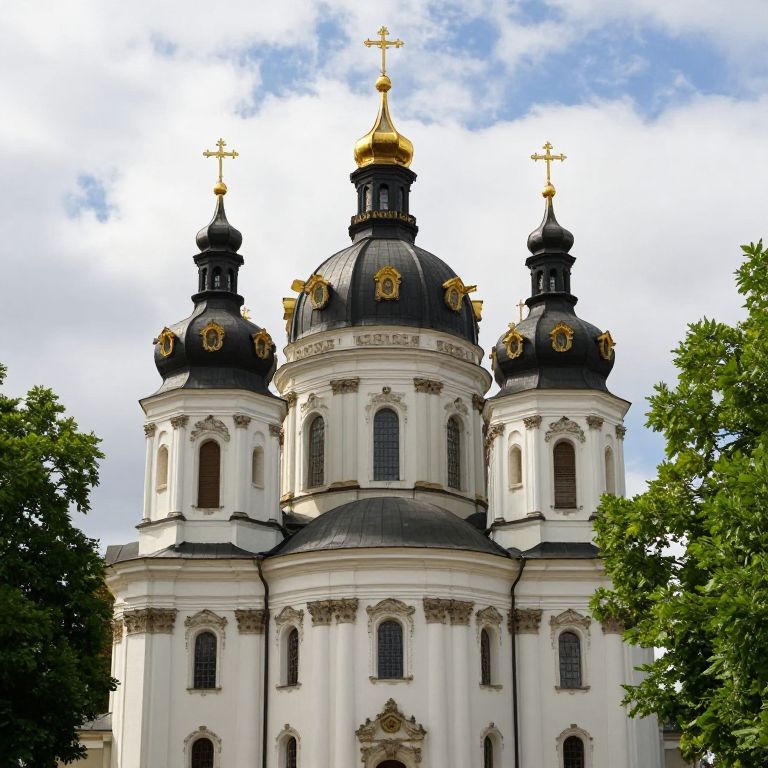 Photograph of a Baroque-style church with three black domes topped with golden crosses, set against a partly cloudy blue sky. The domes are adorned with intricate gold details and surrounded by white, ornately decorated walls featuring arched windows. The lower part of the church shows a detailed stone facade with carvings. Green trees frame the left and right sides of the image, adding a touch of nature to the architectural scene. The image captures the church from the front, highlighting its grand, historical architecture.