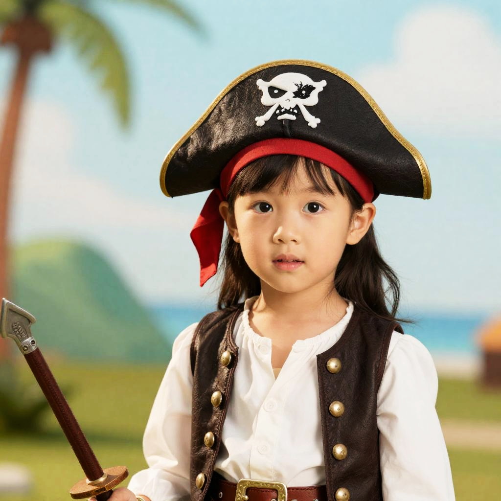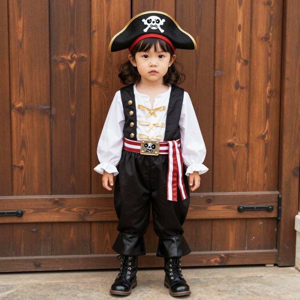 Toddler Pirate Girl Costume, girl dressed in pirate costume standing in front of a wooden wall