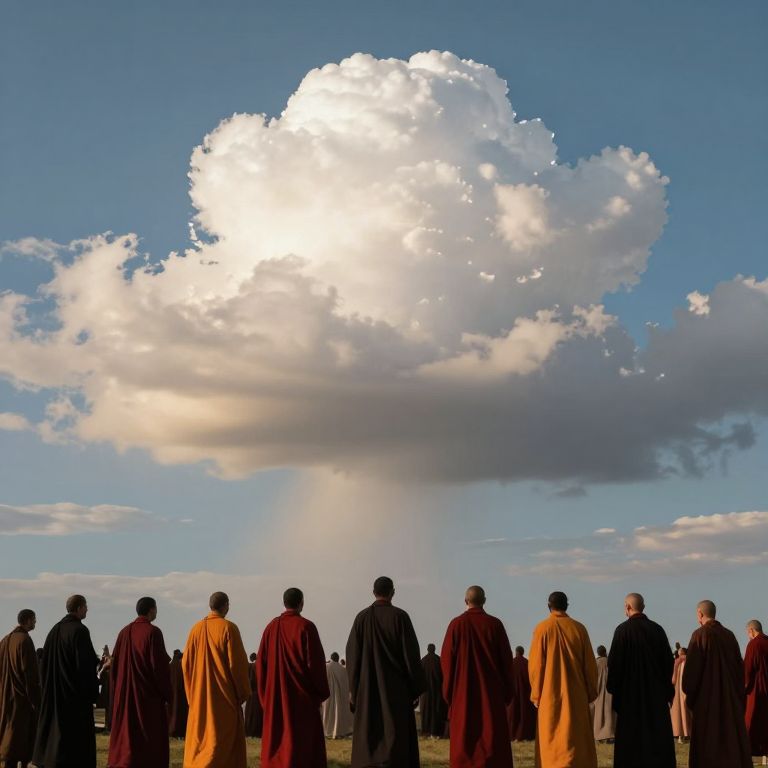 A gathering of robed figures stands in awe beneath a towering, luminous cloud formation that looms like a celestial presence, defying the ordinary boundaries between earth and sky.