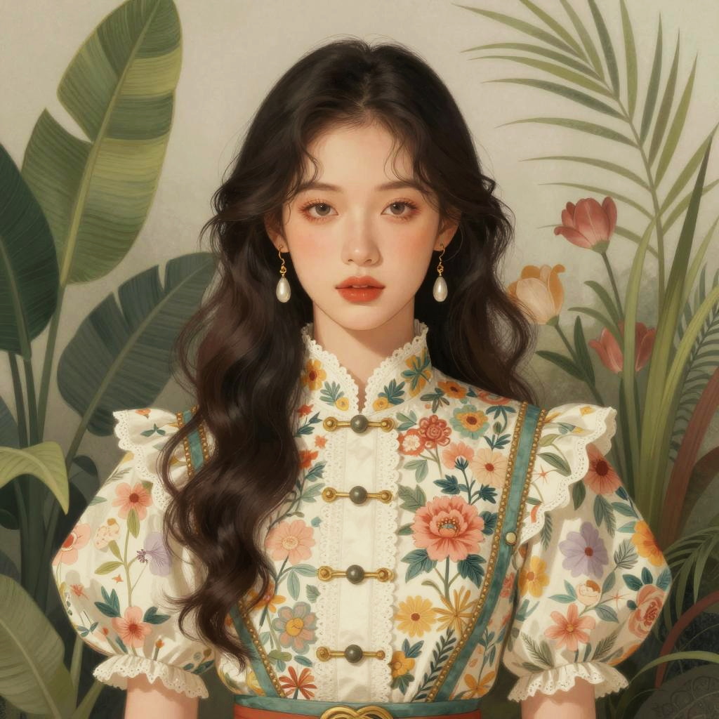 A digital illustration of a young woman with long, wavy dark hair wearing a detailed floral-patterned dress with puffed sleeves and lace trim. She has pearl drop earrings and soft makeup with a natural look. The background features large green leaves and colorful flowers, contributing to a serene, botanical atmosphere. The style blends fantasy elements with realistic digital art techniques.